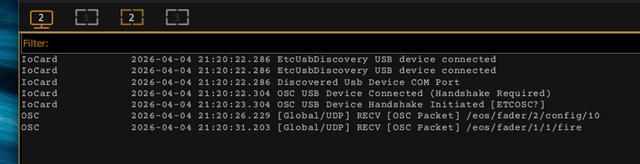 Der Befehl /eos/fader/1/1/fire löst nicht den Button aus. Könnt Ihr auch im Screenshot sehen.
