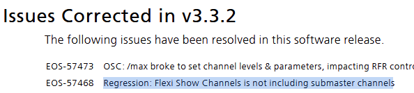 I found the channels I am using in submaster does not show up in [Flexi] {Show} Live Table on version 3.3 which doesn't happen on previous version. or am I missing something on setting? thank you so much
