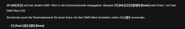 zweimal // postet DMX in die Command Line, z.B. "Chan 11 Magenta @ // 12" postet "Chan 11 Magenta @ DMX 12"