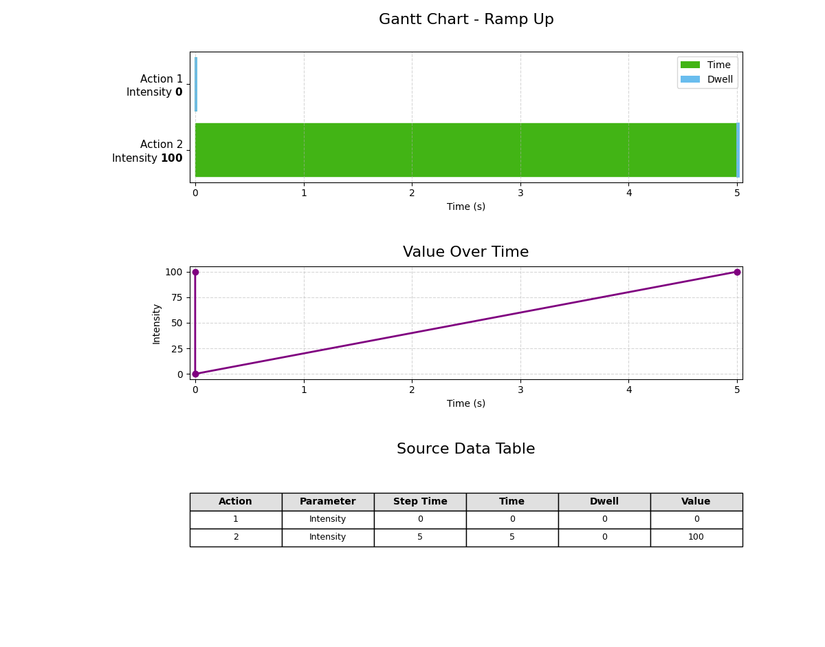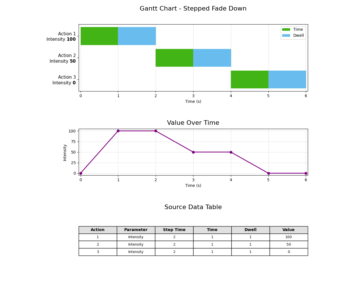 I am a visual learner, so I wrote a python script that takes the actions from a absolute effect and plots them as gantt and line charts.  Before I do more and support things like manual step times, I wanted to make sure I'm on the right track.  I'm very new to EOS and digital boards in general, so I want to make sure my current understanding matches reality.  Here's the first two I did so far with just one parameter.  Thanks so much!