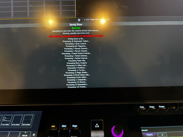 Enoying fault when we save our shows. Warning messages 'EOS "Save failed, unable to write to persistent storage" error.'
