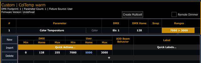 The cool white fixture profile is a copy of the warm, the only change is that the User Min and User Max values are swapped.