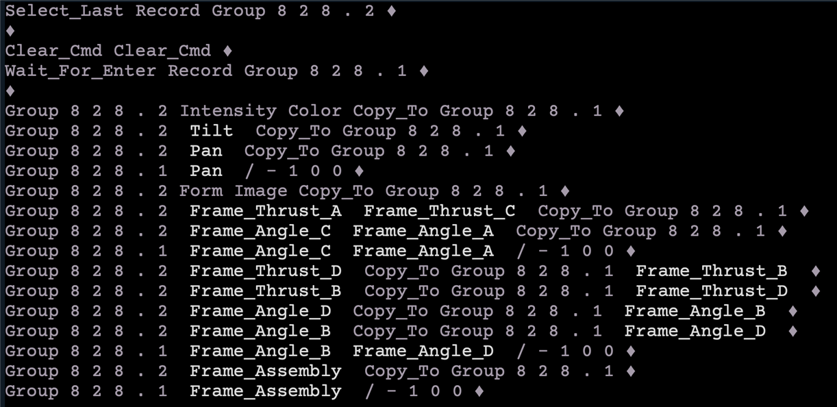 Takes one set of Chans, waits for you to put in a second set, then copies and inverts appropriate things until you have a mirrored copy. Designed for something like a FOH unit. Puts ones B shutter on the others D, but keeps A where it was, but inverts the angle. And then inverts pan and rack.