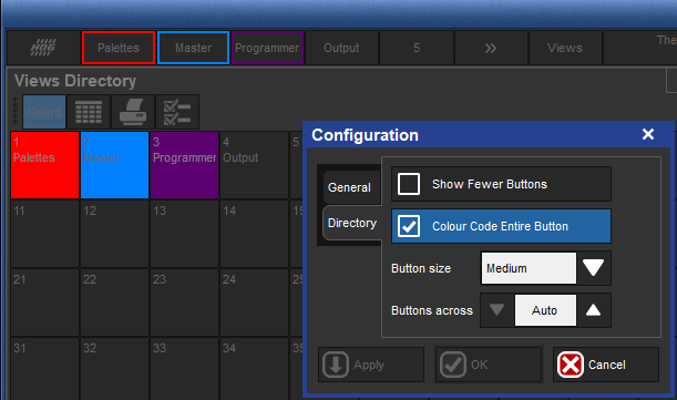 In my opinion this is inconsistent behaviour. When opening the Views Directory and Color Coding my Views i have the option to Color Code the entire button or not. This does work for the View Directory itself but doesn't apply to the View Toolbar.